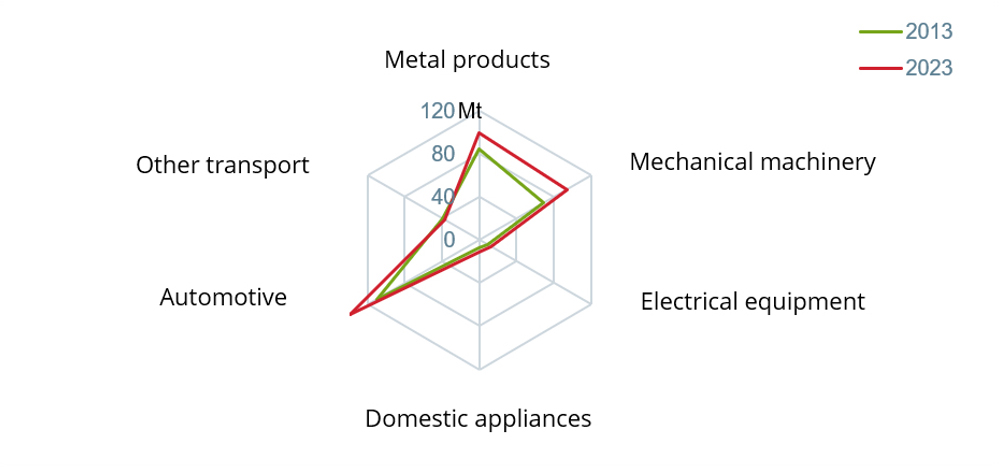 Trade data and results of computations have been further synthesised in this study and presented for six commodity groups: metal products, mechanical machinery, electrical equipment, domestic appliances, automotive and other transport. These match conventional steel-using sector groupings used by worldsteel in the analysis of steel-weighted industrial production (SWIP).