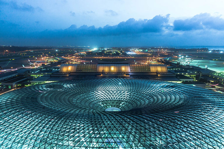 Crowned with a complex steel and glass roof, measuring 200 metres across at the longest span, Jewel Changi Airport posed significant construction challenges. The roof is supported continuously along the rim, with the integrated structure and façade system creating an almost column-free interior.