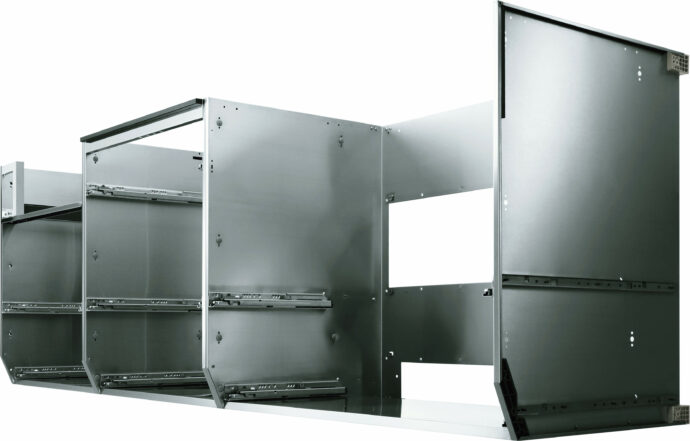 Stainless steel is an easy-to-recycle material with a recycling rate of over 95% (Karlsruhe Institute of Technology and Team Stainless, 2022). At the end of its life, stainless steels are collected as scrap and directly reused to produce new stainless steel, without any downcycling. The Stainless Steel Eco Cabinet is not only an eco-friendly product that uses stainless steel as its material, but its cabinet structure is also designed for easy disassembly and recycling, making it even more sustainable. The design is simple, yet its strength is enhanced by special bending techniques. The use of materials other than stainless steel is minimised, which reduces the need for adhesives, resulting in a low-VOC emissions concept.