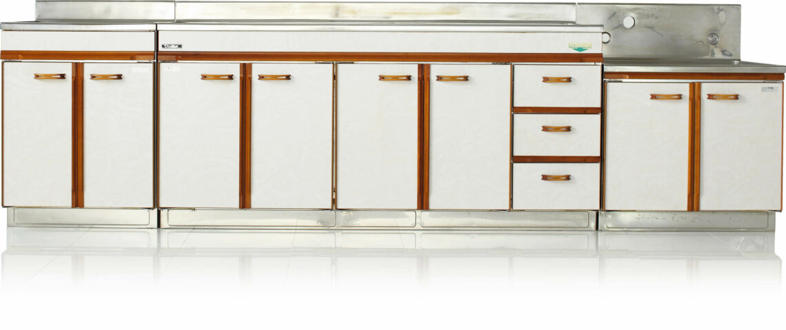 The kitchen in the photograph is an actual unit that has been in use in a general household for over 30 years. Examination revealed no signs of mould or rust, and a structural analysis confirmed that it remained fully functional. Every part, including the rear and interior of the cabinet, retained its pristine condition — qualities that result from the material properties of stainless steel.