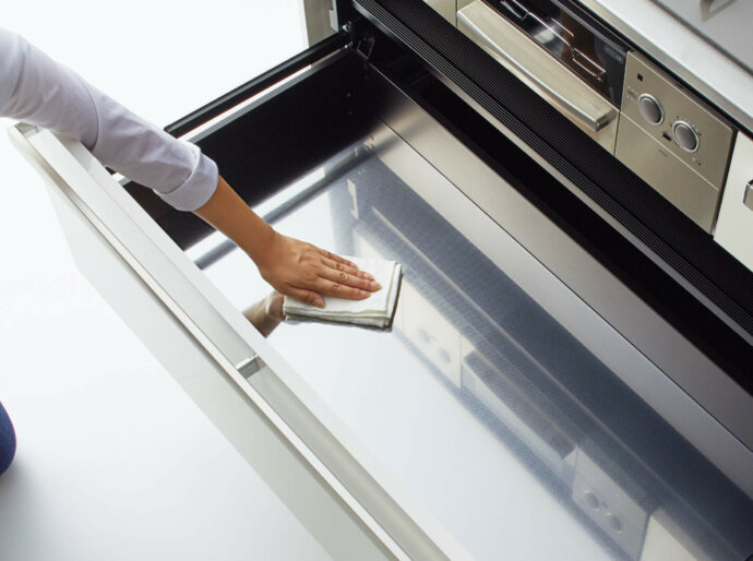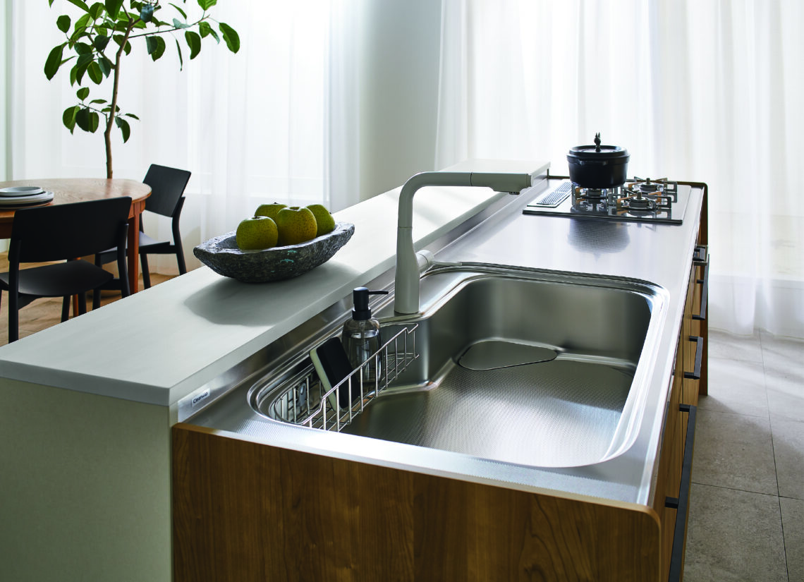 The ‘Stainless Steel Eco Cabinet’ was newly introduced in 2011. In contrast to most kitchens, which use wood for their cabinets, the Stainless Steel Eco Cabinet uses stainless steel in the frame, side panels, bottom, and even the bases of the drawers. Stainless steel is an ideal material for kitchens, particularly in areas that are difficult to clean, as it resists mould and odours caused by daily exposure to water, ensuring long-lasting cleanliness and durability.