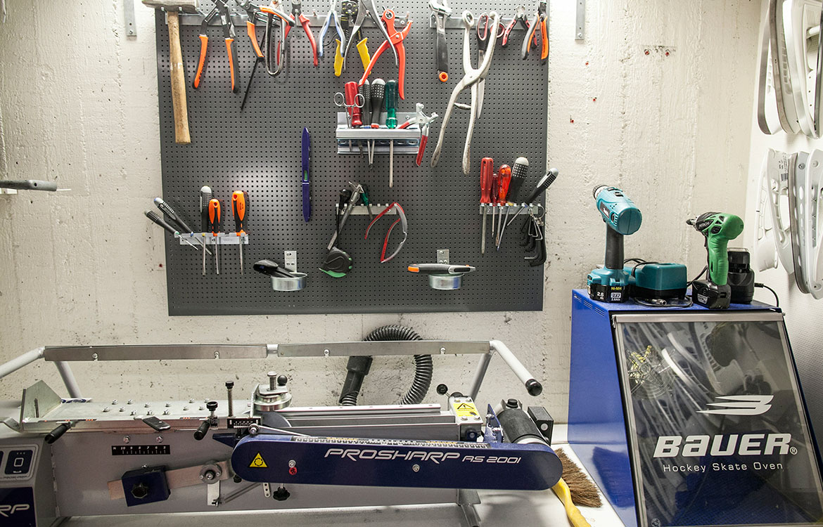 Mattias demonstrates on his state-of-the-art automatic sharpening machine. “A deeper hollow will give you more ‘grip’ on the ice, so your blade will feel sharper and will hold the edges better. A shallower hollow will have less grip but more glide and easier stops and starts.” Where previously his job involved hand-grinding an edge in a clamp, he now has a machine that can automatically carve out different base profiles for individual player preferences, making his job easier physically but more technically demanding.