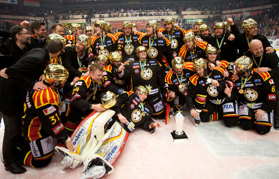 Brynäs IF lift the 2011-12 Le Mat Trophy for winning the Swedish Hockey League Championship