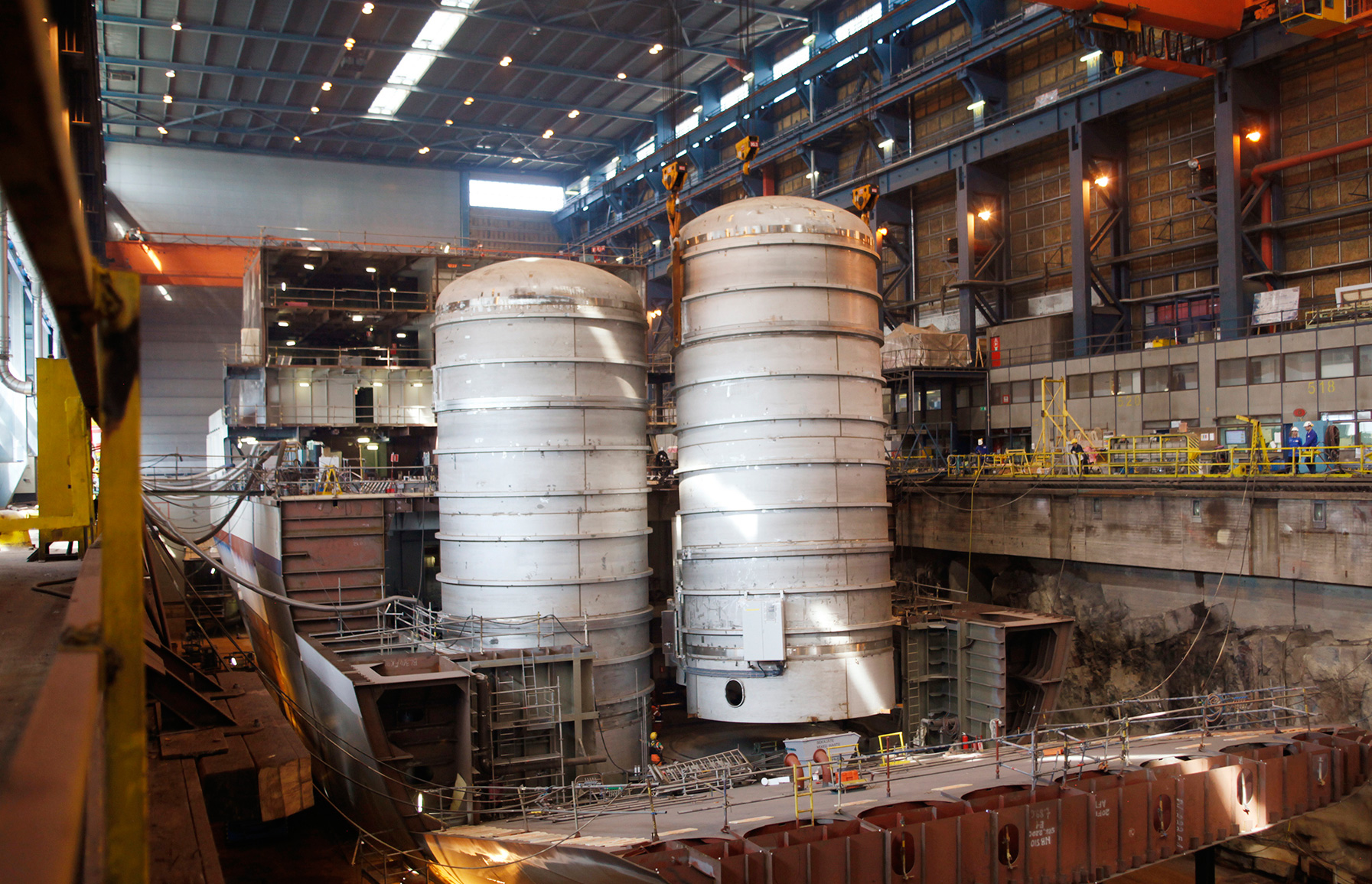在赫尔辛基Arctech造船厂的干船坞可见北极星破冰船的不锈钢船体
