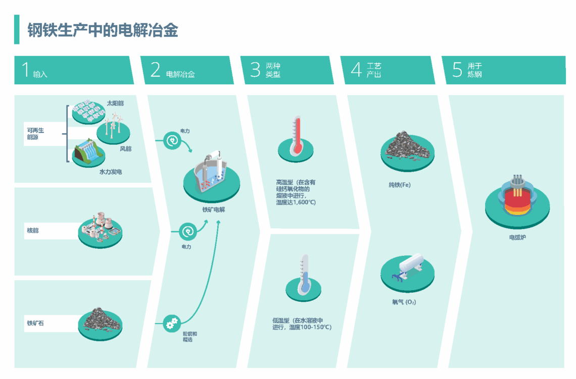 在电解冶金过程中,铁矿石浸没在1,600°C的二氧化硅和氧化钙溶液中,当电流通过电解质溶液时发生分解。带负电的氧离子迁移到带正电的正极后,氧以气泡形式分离。带正电的铁离子迁移到带负电的负极后,被还原成元素铁。如果使用无碳电力,铁的生产过程将不会排放二氧化碳。铁矿石电解技术已在实验室规模全面掌握,可生成金属铁和氧